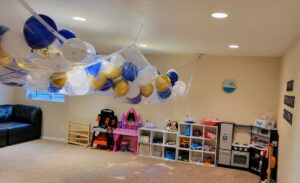 I used three clear shower curtains, a bunch of packing tape, and some fishing line to get these beauty in the air. If you make one of these, do not get the Amazon Basic shower curtains. Now, if you are in the market for a shower curtain, I would highly recommend them, they are freakin’ hefty! Great for a $2 shower curtain, terrible for someone trying to attach three of them full of balloons to the ceiling! It took us a long time and several failed attempt to get this thing hanging and in the end, we had so many strings up that we had to have three adults cutting them at the same time for the drop. It looked cool. The kids loved it. I’m not sure it was worth the hassle.