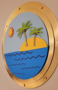 I used a gold foil for the background of the banner which tied in perfectly with the next decoration which is cruise ship port holes! I used Dollar Tree mounting squares in between each paper layer to give it some depth. These turned out so cute I can’t get myself to take them off the walls of the toy room! Pro tip: Hobby Lobby sells giant metallic poster boards for less than a dollar! I used about 5 to make these windows. I cut them on my Silhouette Cameo 4+ so they were a little larger than you could get with a standard cutting machine.