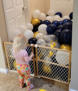 In the past, I have blown up (with my mouth) more and more balloons for each birthday party. This last year I did like 70 and I decided that was beyond my limit. I was pretty light headed. So, when I committed to a 160 balloon drop, I also committed to buying an electric balloon pump. I totally should have invested the money long ago. It was so worth it! Here’s the one I got. Here’s a link to the balloons I got too. I got two of this set and then supplemented with white balloons from Dollar Tree.